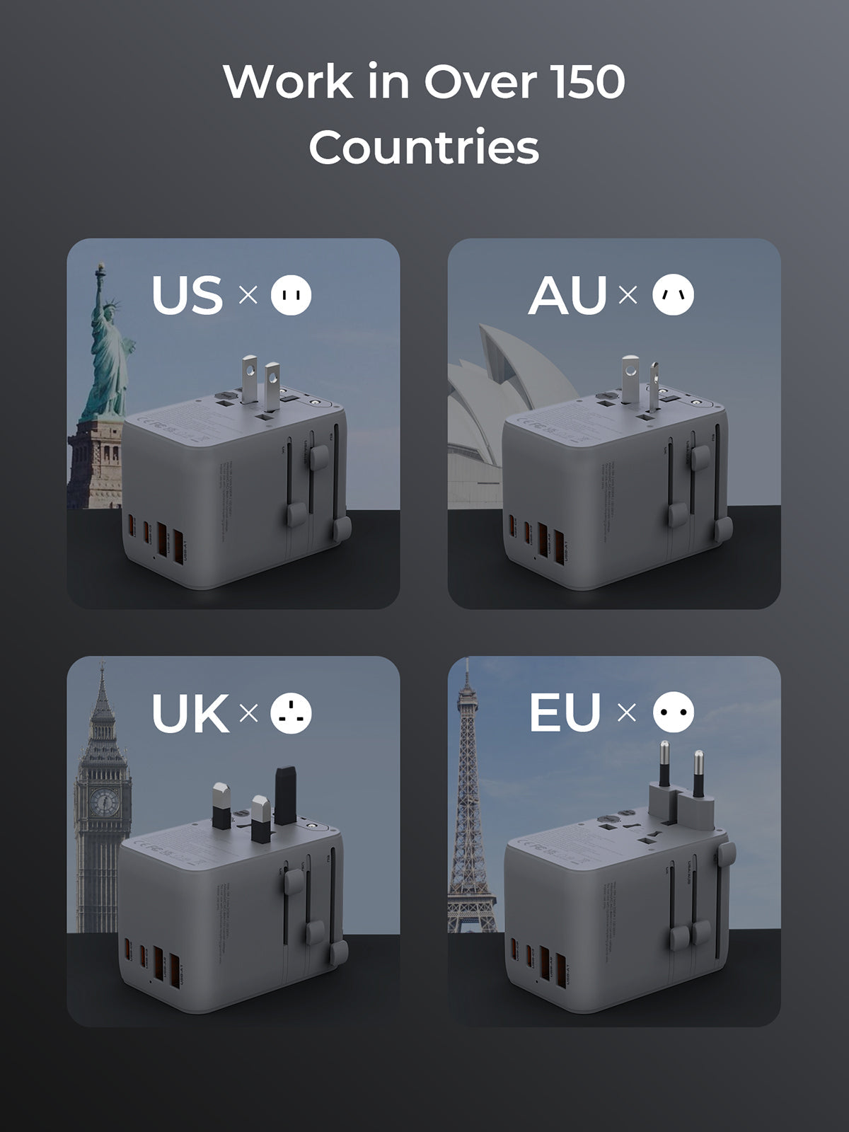 Worldwide Compatibility: This travel adapter supports a wide range of global plug stands, including the US, AU, EU, and UK, allowing you to use it in over 150 countries and regions.